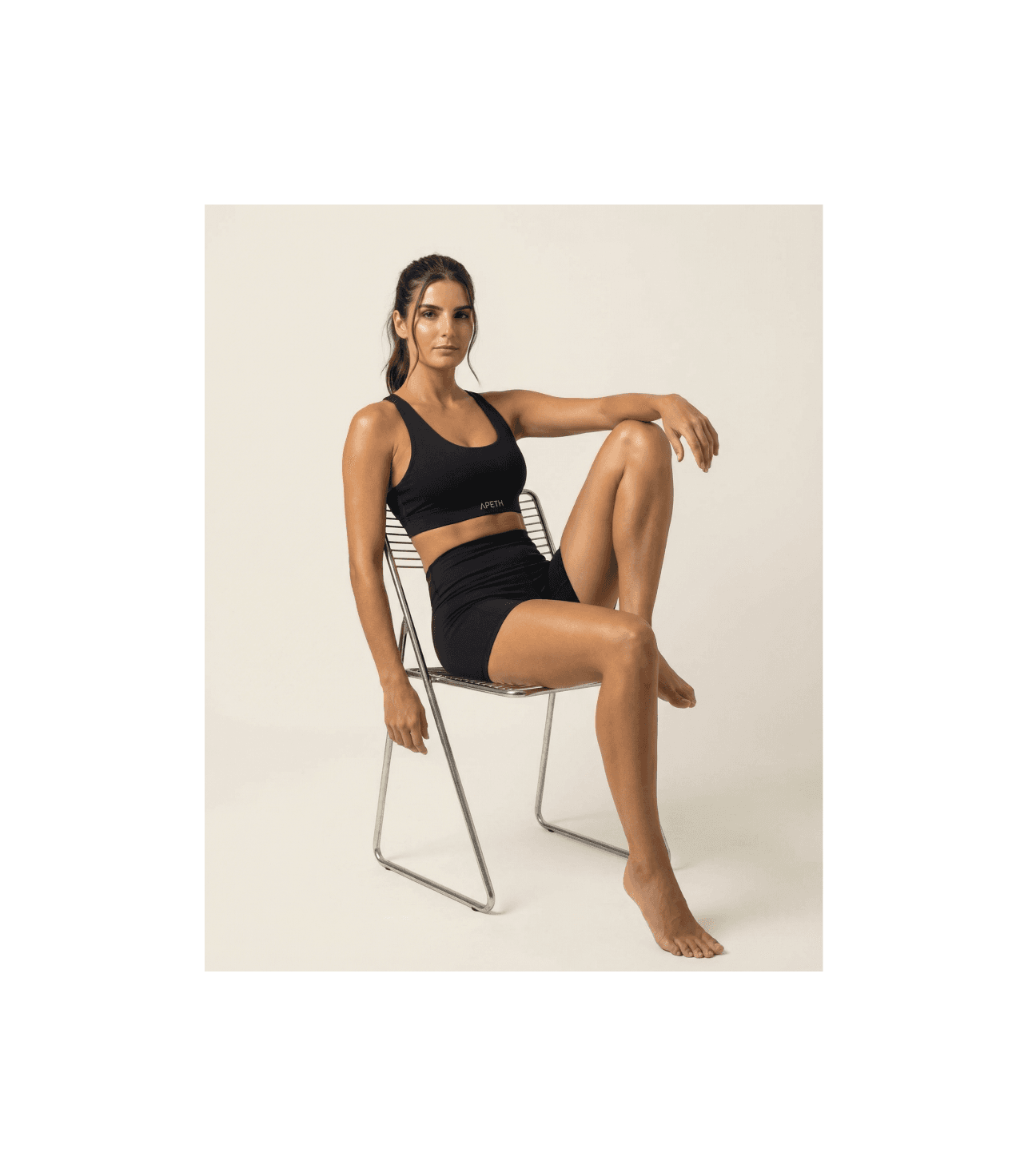 Shorts de cintura alta da linha ΑΡΕΤΗ. Comprimento ideal para treino funcional e musculação, com logo ΑΡΕΤΗ discreto no cós. Compressão modeladora sem restringir o movimento.